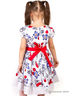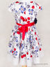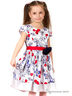 Расклешенное платье с завышенной талией. Круглый вырез горловины, линия талии отделана контрастной лентой. Рукава-фонарики собраны на резинку. Благодаря крою "полусолнце", юбка ложится нежными волнами. По низу юбки вставка из однотонной ткани. Верхняя часть платья на подкладке из тонкой хлопковой ткани. Застегивается сзади на молнию. Украшено декоративным цветком на талии. Оригинальный принт "вишни" - хит наступающего сезона.