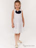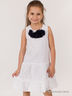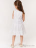 Легкое платье из кружевной ткани без рукавов. По низу подола пришит широкий волан с оборками. Вырез горловины подчеркнут декоративными цветами из ткани и страз. Потайная застежка на молнию на спинке.