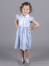 Нежный, воздушный сарафан расклешенного силуэта. Отложной круглый воротник, с рукавами-крылышками, украшен оборками на лифе и по линии талии. Застегивается спереди на пуговицы.