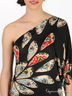 Цветное платье необычного кроя. Цельнокройный рукав с одной стороны, со второй стороны его нет. Платье присборено с одной стороны.