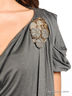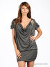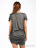 Платье с короткими рукавами. Рукава и низ платья присборены. Вырез-качели. Декоративный элемент.