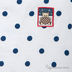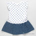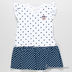 Платье с расклешенной юбкой и коротким рукавом крылышком украшено принтом "горох" и нашивкой на полочке.