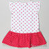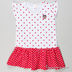 Платье с расклешенной юбкой и коротким рукавом крылышком украшено принтом "горох" и нашивкой на полочке.