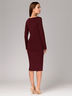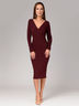 Платье бордовое с рельефными полосами и длинными рукавами.