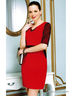 Стильное и нарядное платье для девушек. Рукава 7/8, V - образный вырез горловины, прямой силуэт. Сложный крой с интересным дизайнерским подходом, рукава и линия талии украшена гипюром, по краю горловины пришито украшение из искусственных камней в сетке.