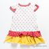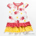 Расклешенная модель с присборенным рукавом застегивается на три пуговицы спереди. Яркие оборки на подоле. Декоративные аппликации по всему изделию.