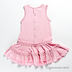 Расклешеная модель на лямках застегивается на пуговицы на спинке. Края изделия и подол украшены атласными лентами. Множественные оборки. Декоративная аппликация на полочке.