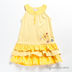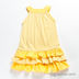 Расклешенная модель из комбинированных тканей. Множественные оборки, декоративные аппликации, вышивка и нашивки на полочке.