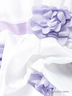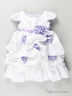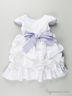 Нарядное платье выполнено из тонкой атласной ткани с батистовой подкладкой. Округлый вырез горловины, застежка на молнию на спине, короткий рукав-крылышко, полочка декорирована стразами, отрезной пояс декорирован объемным цветком, на спинке лента, завязывающаяся в бант, пышный низ изделия декорирован пышными буфами с фактурными цветами и дополнен подкладкой с сетчатой оборкой.