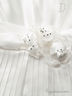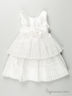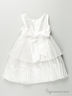 Нарядное платье выполнено из тонкой шелковистой ткани с батистовой подкладкой. Округлый вырез горловины, застежка на молнию на спине, полочка декорирована стразами, отрезной пояс декорирован объемными цветами со стразами, на спинке лента, завязывающаяся в бант, пышный низ изделия декорирован оборками плиссе и дополнен подкладкой с сетчатой оборкой.