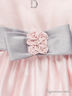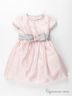 Нарядное платье выполнено из тонкой шелковистой ткани с батистовой подкладкой. Округлый вырез горловины, застежка на молнию на спине, короткий рукав-крылышко, полочка декорирована стразами, широкий шелковистый пояс пристрочен к изделию и декорирован бантом с цветочками, пышный низ изделия дополнен шелковистой подкладкой с сетчатой оборкой.