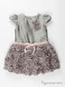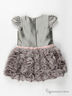 Нарядное платье выполнено из тонкой органзовой ткани с батистовой подкладкой. Округлый вырез горловины, застежка на молнию на спине, короткий рукав-крылышко, полочка декорирована цвет ком со стразом, отрезной пояс выполнен из бархатистой ткани. Отрезная юбка-баллон декорирована сетчатой тканью с фактурными цветами.