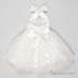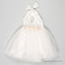 Пышное, нарядное платье с завышенной линией талии. Застежка на шее на две кнопки и на спинке на молнию. Полочка декорирована объемными текстильными цветами с блеском. Отрезная юбка декорирована тремя слоями сетчатой ткани с блеском. Хлопковая подкладка.