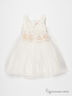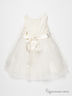 Нарядное платье из тонкой атласной ткани с округлым вырезом горловины, с застежкой на молнию на спине. Полочка декорирована гипюровым кружевом. Отрезная юбка декорирована фатиновым полотном. Пояс декорирован текстильными цветами. Хлопковая подкладка с сеткой хорошо держит форму.