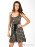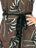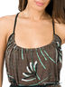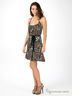 Платье летнее из комбинированной ткани. В верхней части лифа проложена кулиска с продетым в нее шнурком, выполняющим функции бретелей. Прямой крой. На уровне талии расположены шлевки для декоративного трикотажного пояска в мелкий рубчик.