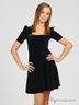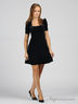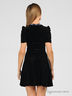 Очаровательное бархатное платье прекрасно подчеркивает фигуру и создает строгий, элегантный образ. Вырез каре декорирован серебристо-серым кантом с пуговицами. Короткие рукава присборенны по боковому шву.