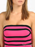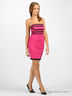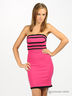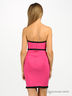 Комфортное и стильное коктельное платье без бретелек. Лиф декорирован черными полосками. Прекрасно сидит по фигуре, сильно подчеркивая талию. Застегивается на молнию сзади. Сдержанная и оригинальная модель выполнена в ярко-розовом цвете.