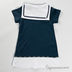 Модель слегка расклешенного силуэта. Воротник-матроска с рисунком имитирующим веревку. Край платья белый, отделен плотной лентой с названием бренда.
