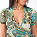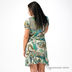 Очаровательное легкое трикотажное платье пестрой расцветки. Имитация запаха с завязками. Короткие рукава. Низ изделия декорирован воланом.