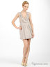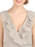 Детали: глубокий v-образный вырез с запахом, полочка украшена рюшами, без рукавов, втачной пояс с завязками