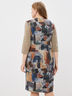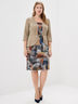 Платье выполнено из мягкой трикотажной ткани полуприлегающего силуэта. Перед изделия выделен однотонными симметричными вставками из однотонной ткани. По спинке идут две вытачки.