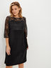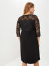Платье выполнено из двух видов ткани полуприлегающего силуэта. По переду располагается кокетка из прозрачного кружева, от кокетки вниз идут рельефы. Верх изделия изготовлен из нарядного гипюра. Юбка платья выполнена из плотной ткани с декоративной складкой-фалдой. Рукав втачной 3/4 из кружевной ткани. По спинке платья проходит кокетка, юбка платья со среднем швом и шлицей. Модель с завышенной талией.