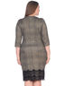 Платье выполнено из мягкой трикотажной ткани, полуприлегающего силуэта. По переду от проймы вниз идут рельефные швы, в районе бедер расположены листочки контрастного цвета, имитирующие карманы. Рукав втачной 3/4 . Спинка платья выполнена из основной ткани, со среднем швом и шлицей. Низ платья декорирован изящным кружевом.