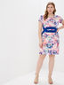 Платье приталенного силуэта выполнено в контрастной расцветке. Модель с короткими рукавами и круглым вырезом горловины.