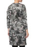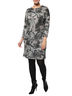 Платье выполнено из теплой трикотажной ткани полуприлегающего силуэта. Перед изделия без особенностей, горловина оформлена обтачкой, по низу изделия проходит широкий манжет. Спинка со среднем швом. Рукав полной длины со спущенной проймой на широком манжете.