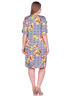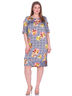 Платье прямого кроя, дополнено контрастным принтом. Круглый вырез горловины, короткие рукава, длина миди.