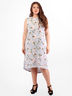 Платье прямого кроя выполнено в контрастной расцветке. Круглый вырез горловины, без рукавов, длина миди.
