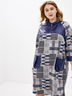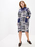Платье свободного силуэта, выполнено из двух видов ткани, основная - трикотажное полотно и отделка - искусственная кожа. По переду расположена кокетка с металлической молнией со стразами, ниже идут оригинальные накладные карманы с пуговицами. Молния функционирует. Рукав реглан 3/4, в шве притачивания нижней части рукава и манжет находятся декоративные разрезы. Спинка изделия без особенностей. Асимметричный низ изделия добавляет шарм и элегантность.