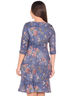 Платье выполнено из трикотажной ткани с люрексом, приталенного силуэта. Горловина оформлена плавным вырезом в виде капли, декорированной бусиной искусственного жемчуга. От оката рукава вниз идут рельефные швы, за счет которых добивается эффект «годе» небольшого расклешения к низу платья. Рукав втачной 3/4 на манжете с кокетливыми овальными вырезами Спинка платья выполнена из основной ткани, рельефные швы сохраняются.