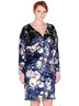 Платье прямого силуэта, выполнено из мягкого футера 3-х нитки. Перед и спинка изделия без особенностей. Рукав со спущенной проймой, выполнен из хлопковой рубашечной ткани, с разрезом и завязками, манжет фиксируется кнопкой. Низ изделия, плечевой шов и пройма рукава в качестве дизайнерского решения никак не обработаны.