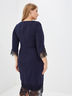 Платье выполнено из мягкой трикотажной ткани прилегающего силуэта. Перед изделия без особенностей, рукав втачной 3/4. Спинка со среднем швом и шлицей.