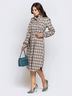 Клетчатое платье из плотной костюмной ткани. Модель с воротником стойка и накладным карманом на полочке. Застегивается изделие на пуговицы по планке. По бокам разрезы. Комплектуется поясом в цвет основы. Прекрасно подойдет на фигуру «прямоугольник».