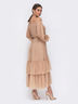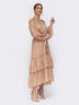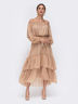 Женственное платье с открытой линией плеч из мерцающей трикотажной сетки. Модель с объёмным рукавом и расклешенной многоярусной юбкой. Горловина и пояс дополнены эластичной тесьмой. Пояс в комплекте. Отлично подойдёт обладательницам фигуры типа "песочные часы", "груша" и "прямоугольник".