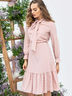 Струящееся платье в горошек с воротником аскот. Талия на резинке. Понизу изделие дополнено широким воланом.