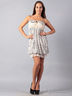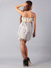 Модное короткое женское платье без бретелей расцветки в горошек. В область груди вшита резинка эластичная и украшена ажурной вставкой, над грудью из широкой резинки выходит декоративный бантик из материала платья, снизу юбка немного подогнута и собрана, подол украшен ажурной тканью, платье с подкладкой.