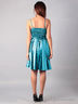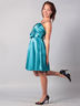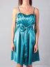 Восхитительное женское платье на узких бретелях. Длина чуть ниже колена, на спине вставка из широкой резинки, ткань на груди в косую узкую складку, на талии большой бант, украшенный металлической вставкой со стразами, под бантом атласные ленты для завязки на спине.