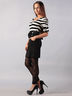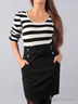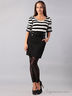 Роскошное трикотажное женское платье. Верх вязанный, рукав 2\3, низ рукавов собран по линии шва, верх платья расцветки в широкую горизонтальную полоску, на талии декоративная вставка из банта и четырех пуговиц (по две с каждой стороны), юбка черная, узкая, на талии сзади широкие завязки.