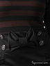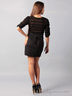 Роскошное трикотажное женское платье. Верх вязанный, рукав 2\3, низ рукавов собран по линии шва, верх платья расцветки в широкую горизонтальную полоску, на талии декоративная вставка из банта и четырех пуговиц (по две с каждой стороны), юбка черная, узкая, на талии сзади широкие завязки.