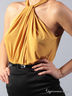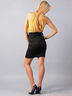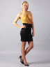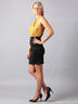Строгое женское платье без рукавов. Область декольте закрыта, лямка на пуговицах вокруг шеи, спина закрыта (такой же вид как спереди), только под пуговицами на шее небольшой вырез на спине, вставка из узкого лакированного ремешка.