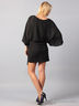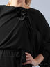 Оригинальное женское платье чуть выше колена. Верх выполнен как легкая блуза без пуговиц с длинным рукавом, широкие сборенные манжеты на пуговицах, на левой груди брошь-роза из материала, юбка узкая с горизонтальной прострочкой, вставка из матерчатого ремешка.