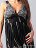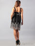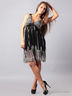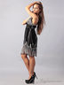 Элегантное женское платье. Короткое, на бретелях средней ширины, V-образный вырез, на спине вставка из широкой резинки, под грудью горизонтальная полоса со складками, юбка расклешенная, белые узоры внизу, под юбкой подкладка.
