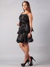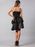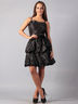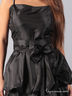 Коктейльное платье на тонких бретелях. Грудь закрыта, на спине вставка из широкой резинки, пышная юбка двухуровневая (один над другим), на талии пояс-завязки, спереди пояс украшен бантом.