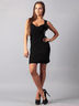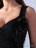 Строгое легкое короткое платье. Широкие лямки, на спине круглый вырез, передние лямки украшены нашивкой из ажура, на груди двойная ткань как запах, левая грудь украшена брошью-цветком с лентами и бусинами.