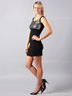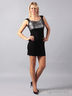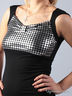 Строгое женское обтягивающее платье. Без рукавов, вся область груди в блестящий мелкий кружок-апликацию, лиф присобран хлястиком, длина мини-юбки.