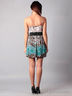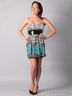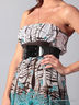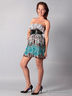 Новомодное короткое платье без бретелей. Сверху в ткань вшита тонкая резинка, на талии горизонтальная вставка-резинка, поверх которой идет ремень широкий с лакированными концами (на концах ремня по две застежки), юбка подогнута снизу, создается летящий эффект, платье с подкладкой, т.к. ткань полупрозрачная с рисунком цветов.