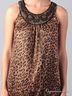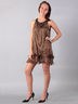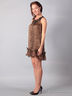 Расклешенное свободное платье без рукавов. Круглый ворот, расшитый деревянным бисером и деревянными круглыми украшениями, ткань леопардовой расцветки полупрозрачная, с подкладкой, внизу юбка с оборочками.